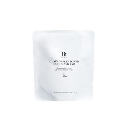 BENTON Guava 70 Skin Toner Face Mask Pad hydrates, soothes, and brightens skin with 70% guava leaf extract, hyaluronic acid, ceramides, and botanical extracts.