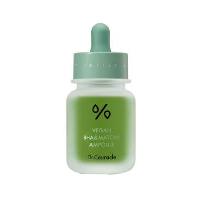 DR. CEURACLE Vegan BHA Ampoule exfoliates pores and calms oily skin with 0.5% salicylic acid, Jeju matcha, and a 9-peptide complex for balance and clarity.