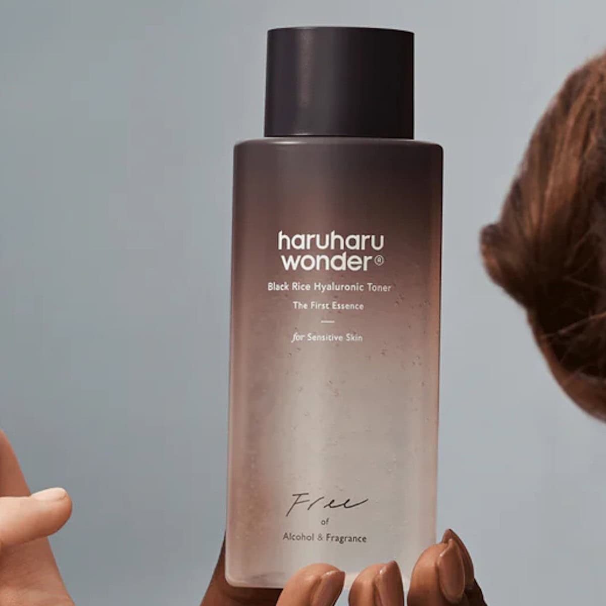 HARUHARU WONDER toner hydrates and soothes sensitive skin with fermented black rice extract and hyaluronic acid.