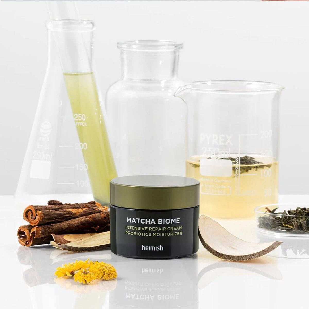 HEIMISH Matcha Biome Intensive Repair Cream provides intensive nourishment with matcha and probiotics, repairing, calming, and revitalizing skin.