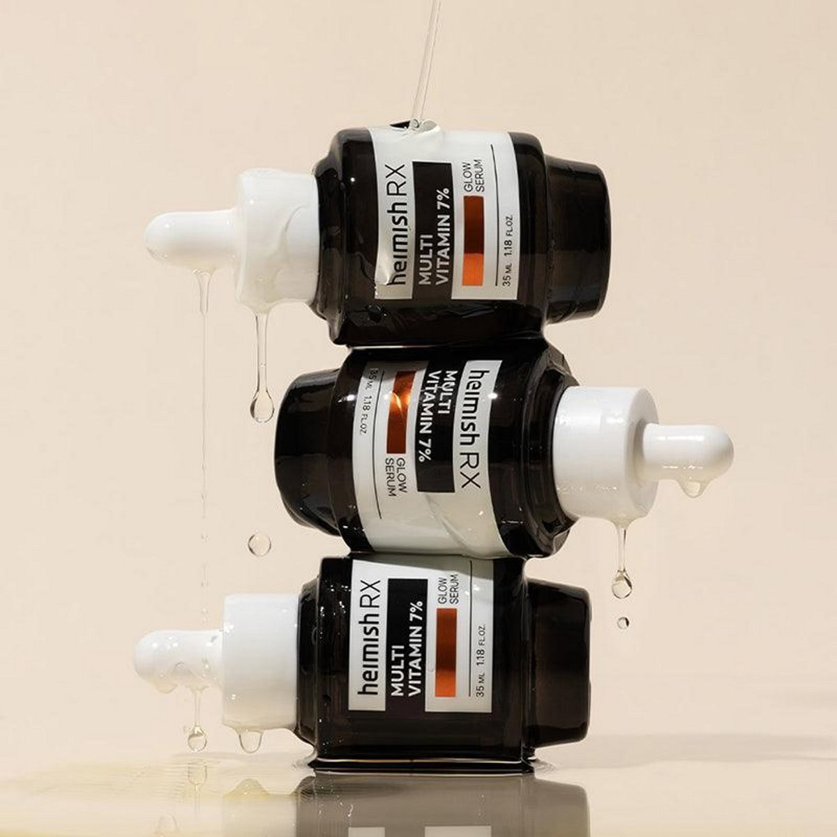 HEIMISH RX Multi Vitamin Glow Serum brightens and evens skin tone with 7% Vitamin C and 2% Niacinamide, enhancing radiance and providing antioxidant protection.