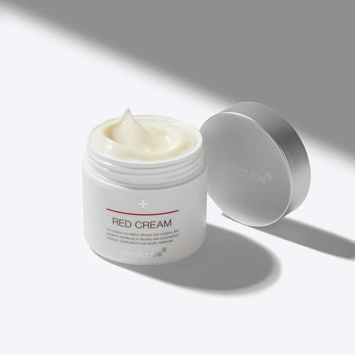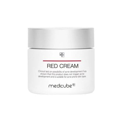 MEDICUBE Red Cream 2.0 soothes and refines skin with niacinamide, salicylic acid, BHA, tea tree oil, centella, panthenol, zinc PCA, and colloidal sulfur.