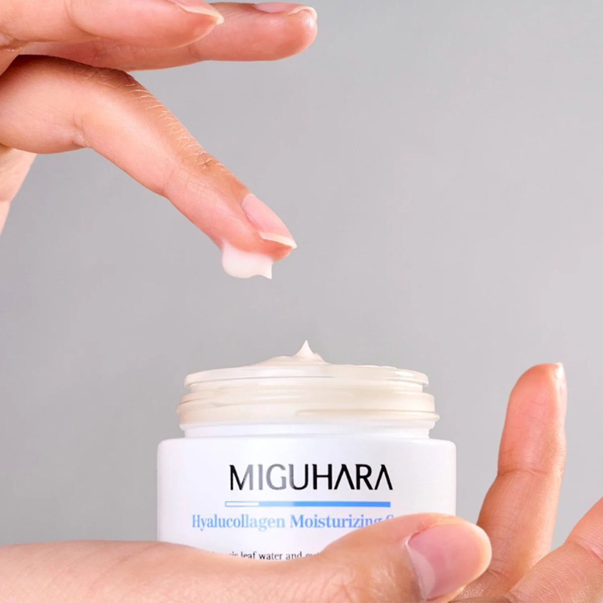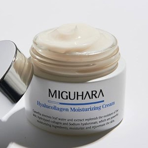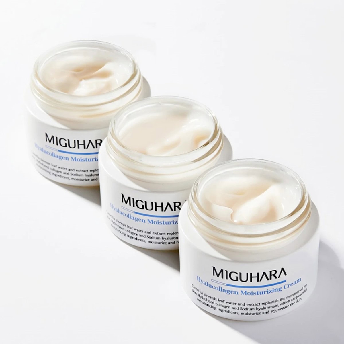 MIGUHARA Hyalucollagen Moisturizing Cream combines hyaluronic acid and collagen to deliver deep hydration and enhance skin elasticity.