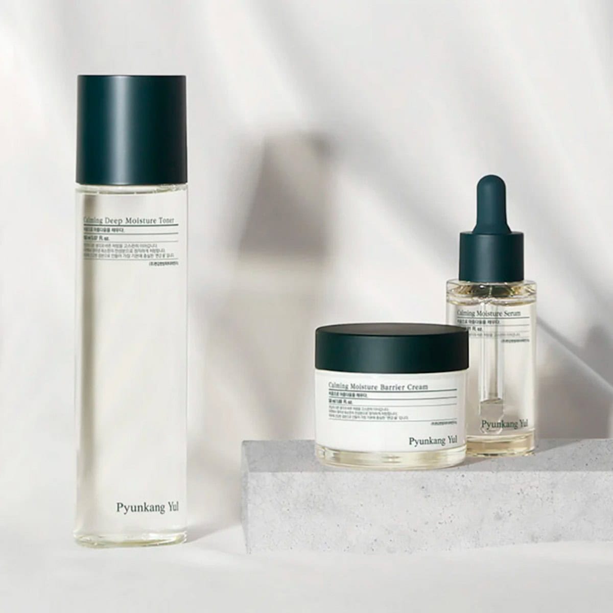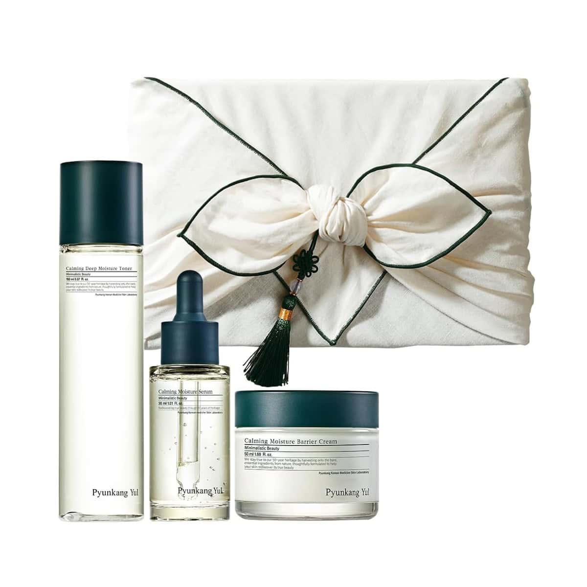 PYUNKANG YUL calming set soothes, hydrates, and strengthens with centella, tea tree, hyaluronic acid, panthenol, and peptides.