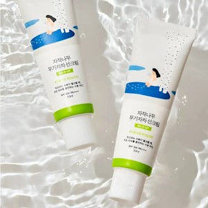 ROUND LAB hydrating sunscreen protects and brightens with birch sap, Vita hyaluronic acid, niacinamide, antioxidants, reef-safe UV filters.