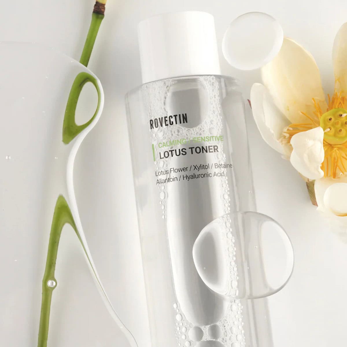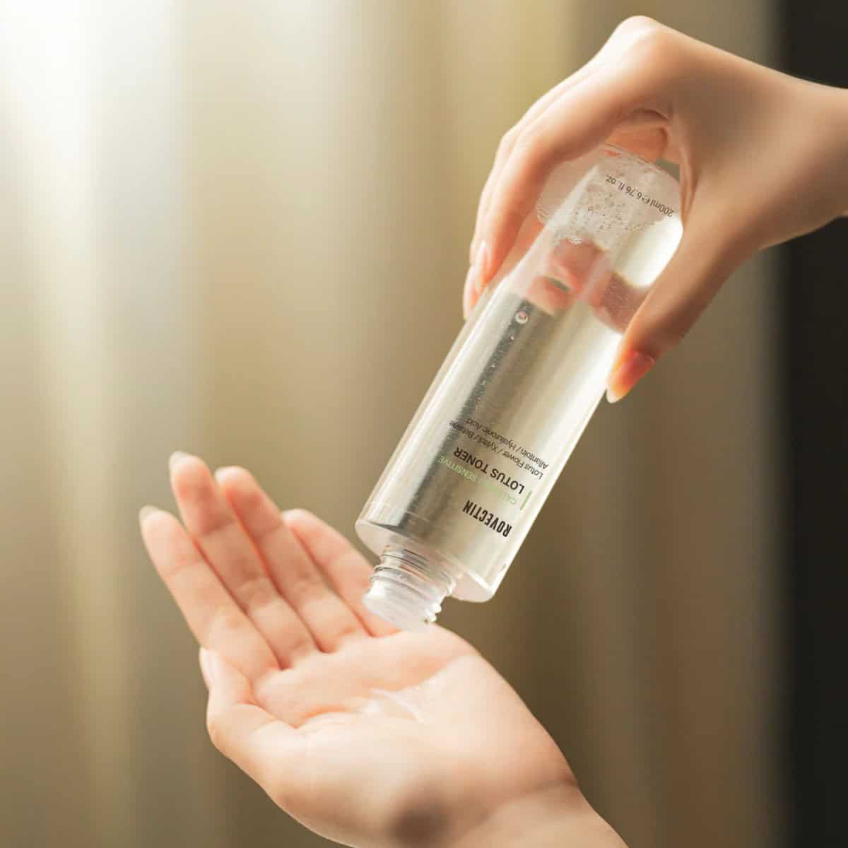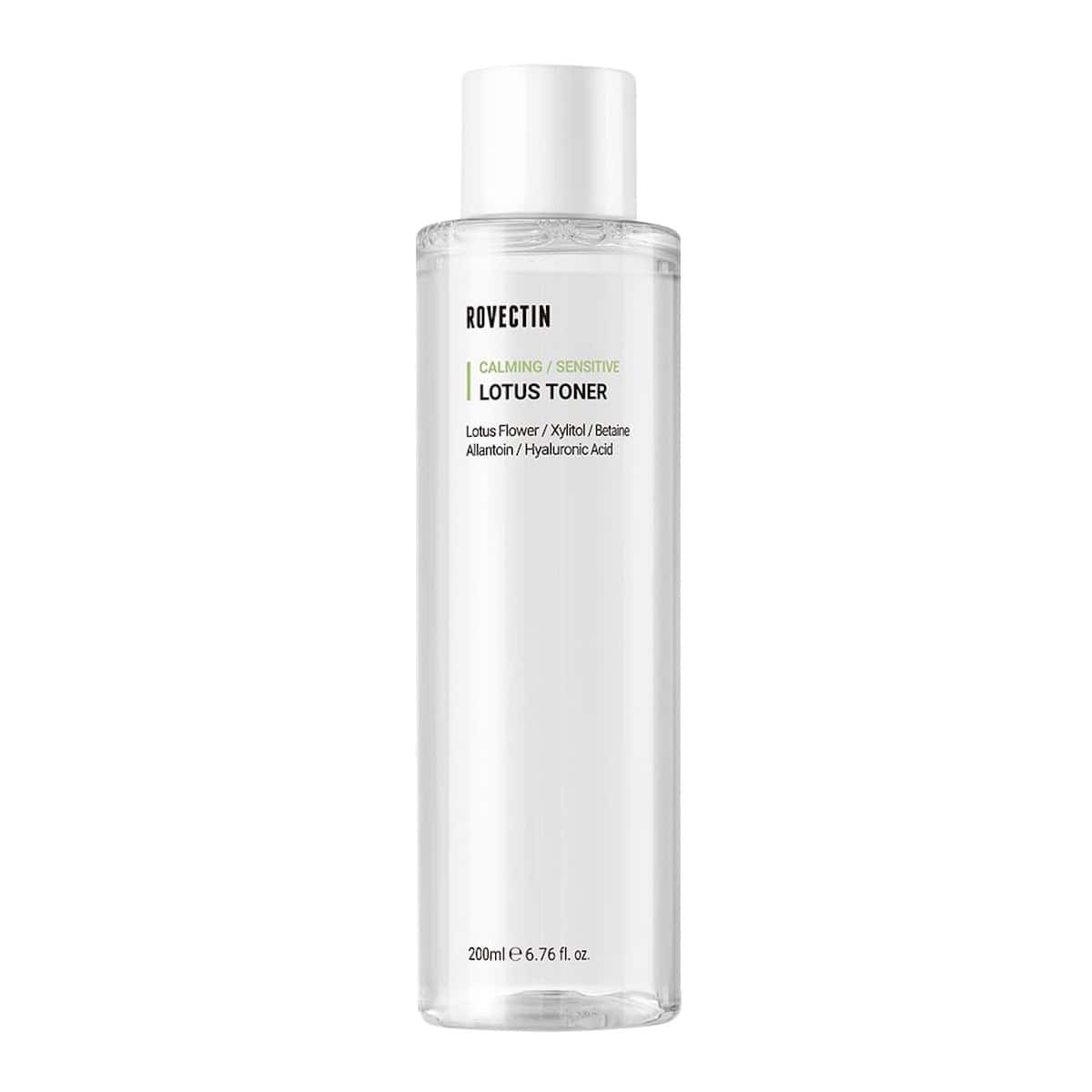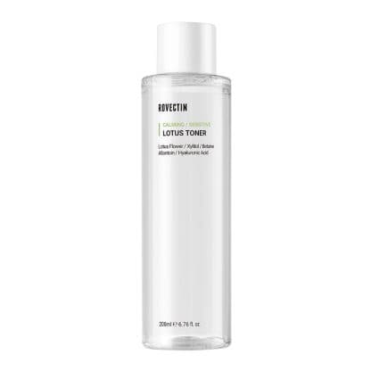 ROVECTIN Calming Lotus Toner hydrates, soothes, and strengthens the skin barrier with lotus extract, panthenol, and antioxidants.