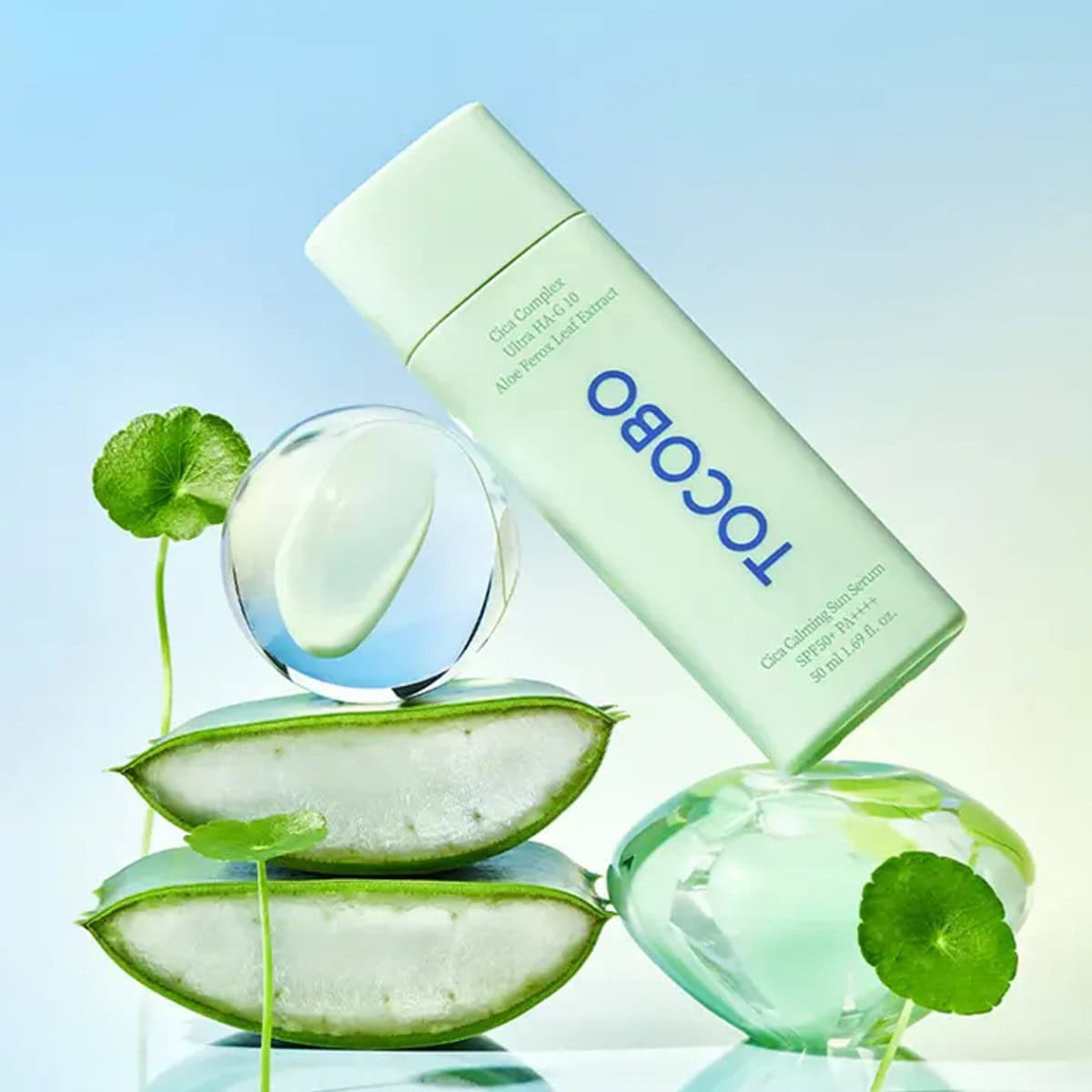 TOCOBO Cica Calming Sun Serum provides high SPF50+ PA++++ protection while soothing sensitive skin with centella asiatica extract.